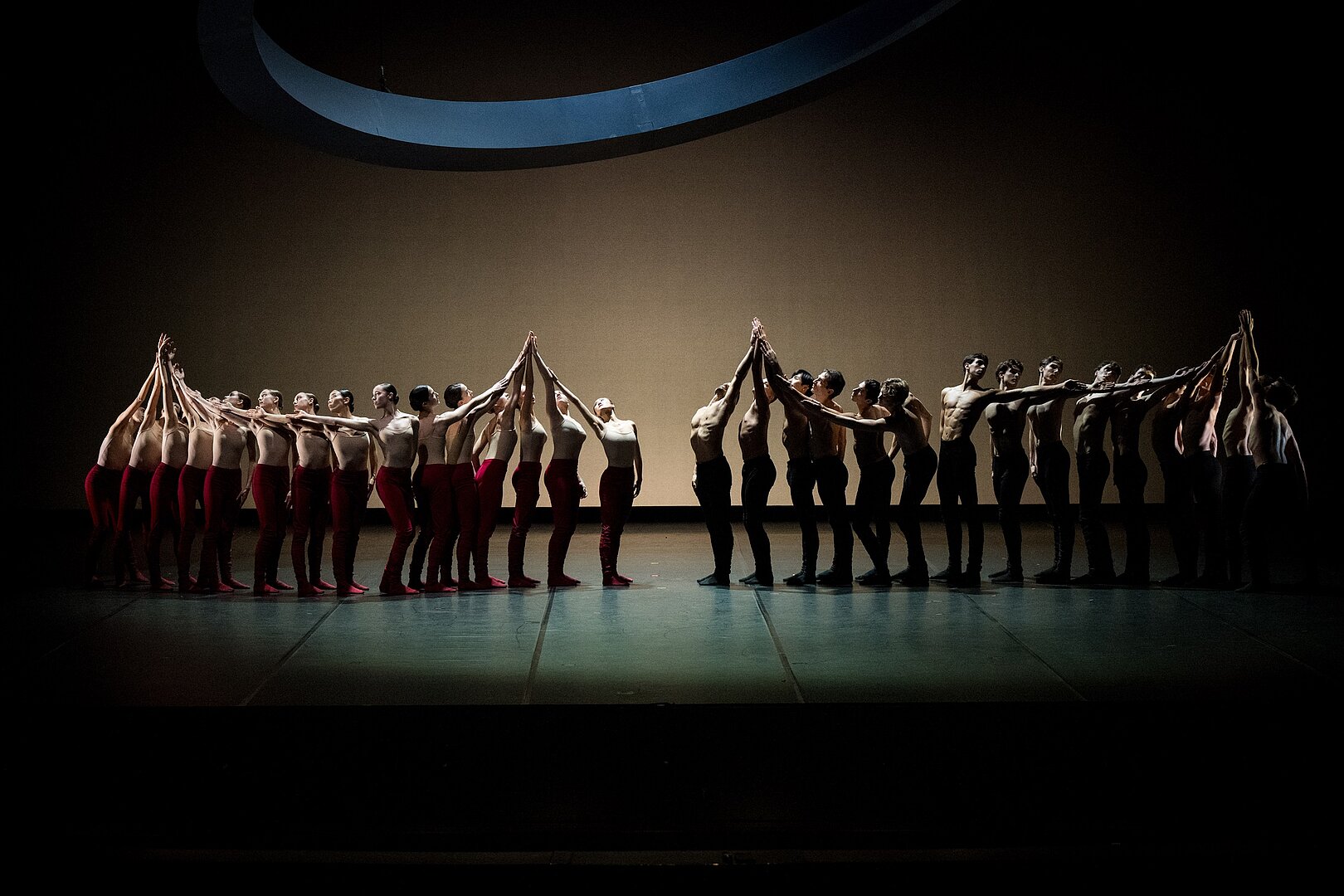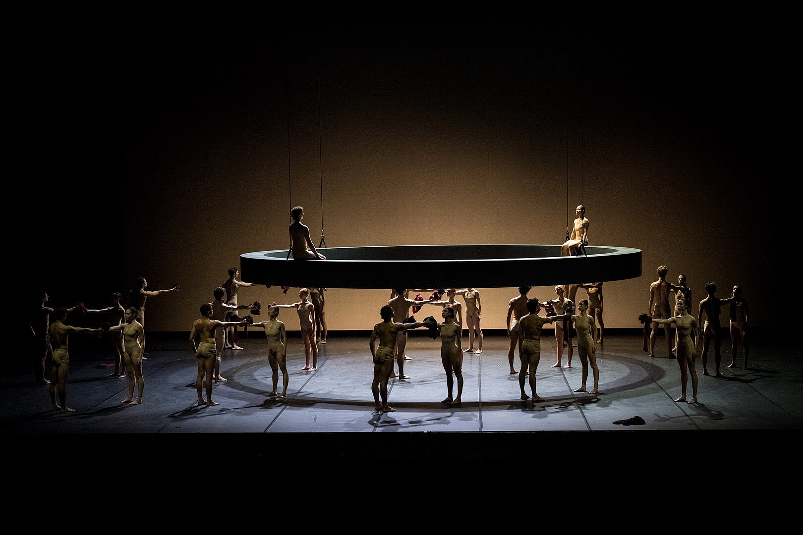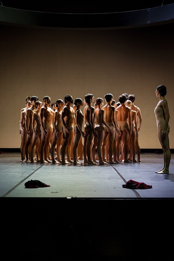 All das ist eindrucksvoll und großartig umgesetzt von 30 Tänzerinnen und Tänzern der Dortmunder Compagnie und des NRW Juniorballetts, die am Schluss in hautfarbenen Trikots (Kostüme: Leo Kulaš) wie nackte Körper verschmelzen. Masse statt Indviduum ist der rote Faden dieser Chorografie.“