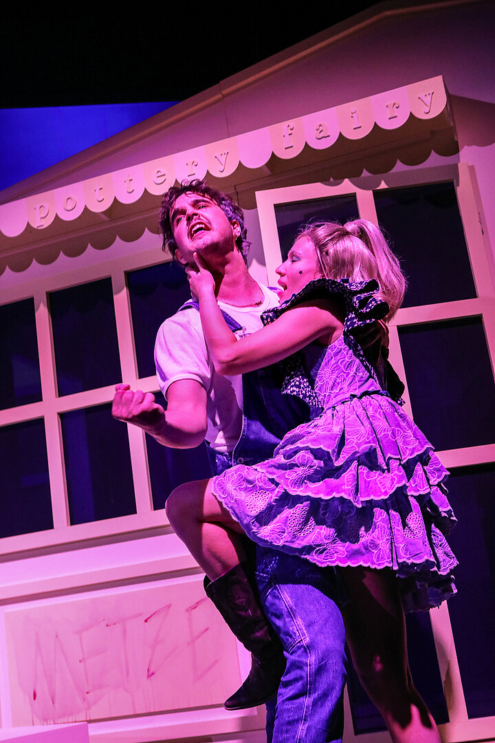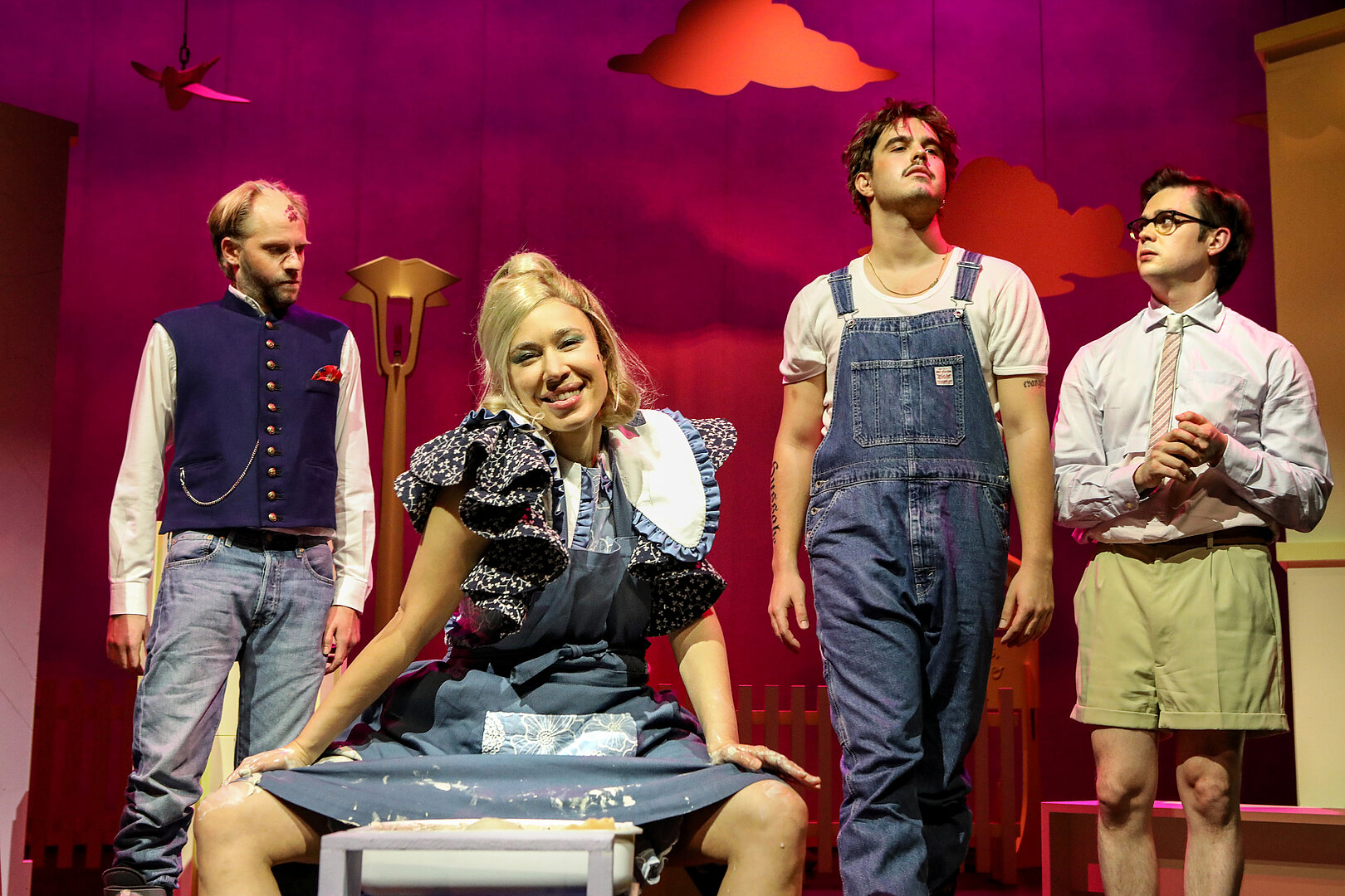 In Lola Fuchs’ Inszenierung wird aus der klassischen Gerichtskomödie eine bissige Mediensatire. Eve ist hier als „Pottery Fairy“ auf Instagram bekannt, Marthe eine gescheiterte Serienunternehmerin mit Faible für Steviapillen, Naturbinden und Selfies mit C-Promis. Dorfrichter Adam alias „Mr. A“, der sich gern als moralische Instanz und Kümmerer inszeniert, entpuppt sich nach und nach als übergriffiger Machtmensch mit einer höchst ungesunden Obsession für Eve.