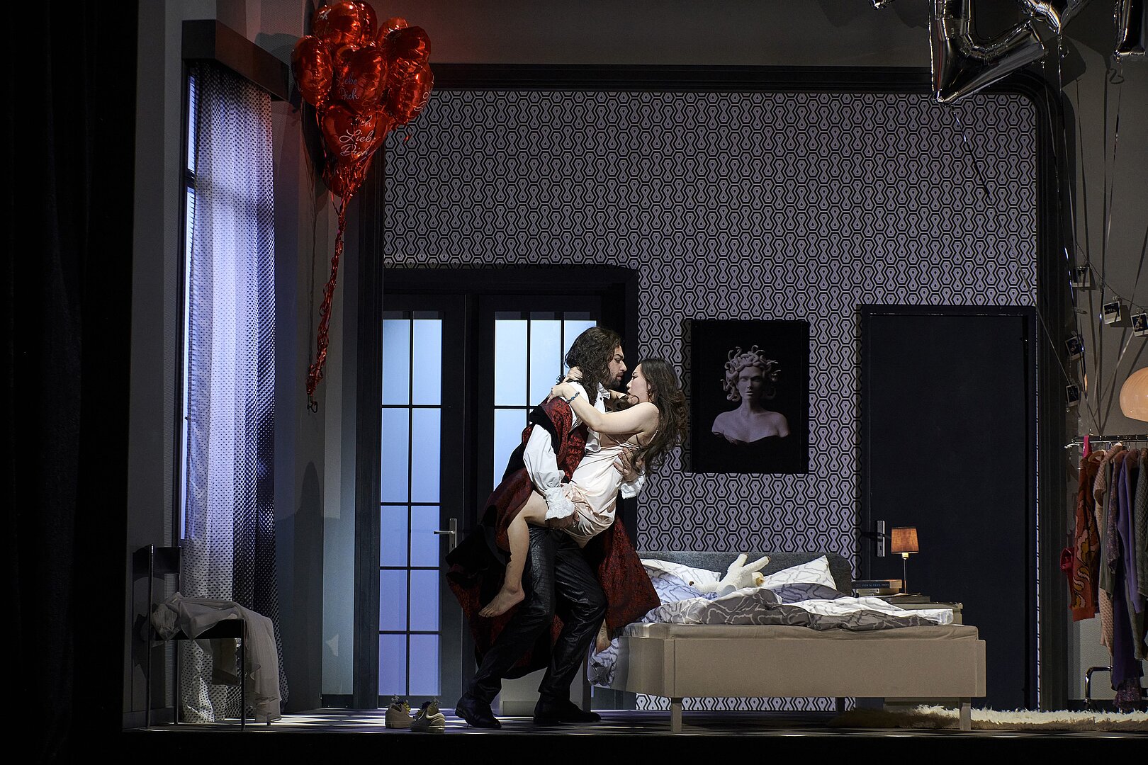Das ist äußerst nachvollziehbar, oft humorvoll inszeniert und gibt den Sängern doch Raum, sich jenseits der komödiantischen Rezitative – Petrou begleitet sie betont salopp – in ihren Arien zu vertiefen. Bewusst eindimensional bleibt dabei der Verführer selbst, dem Denis Velev einen warmen, kraftvollen Bariton verleiht.