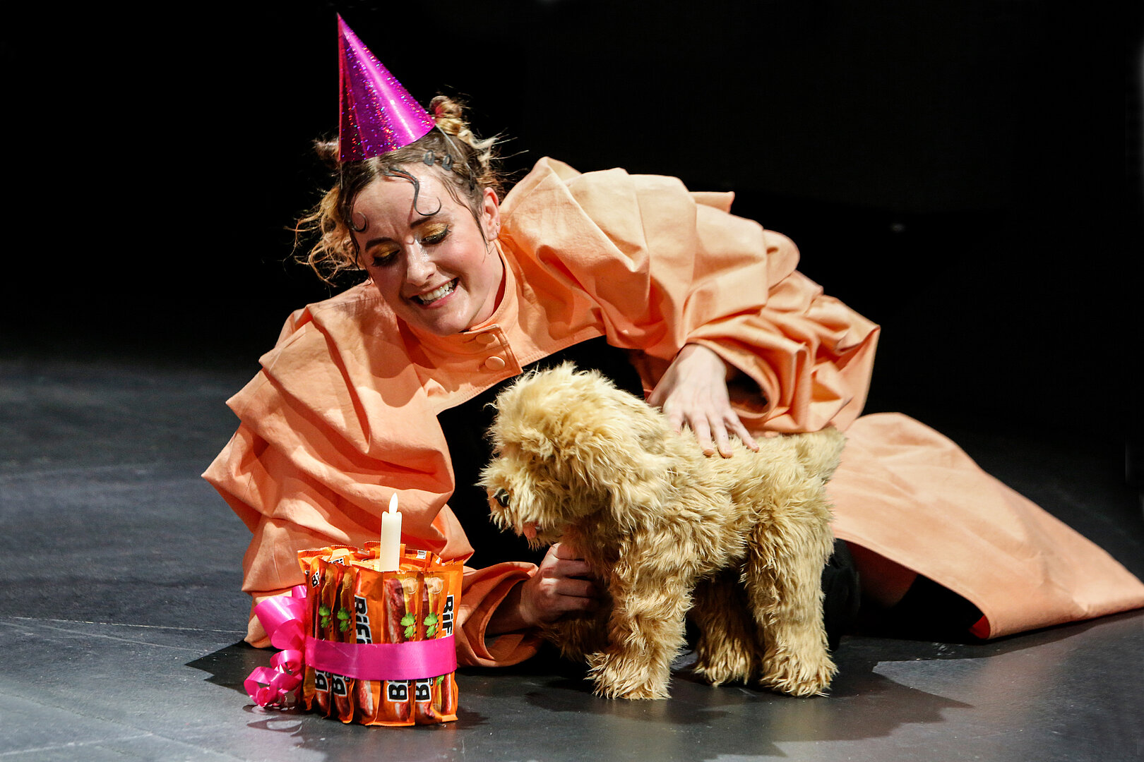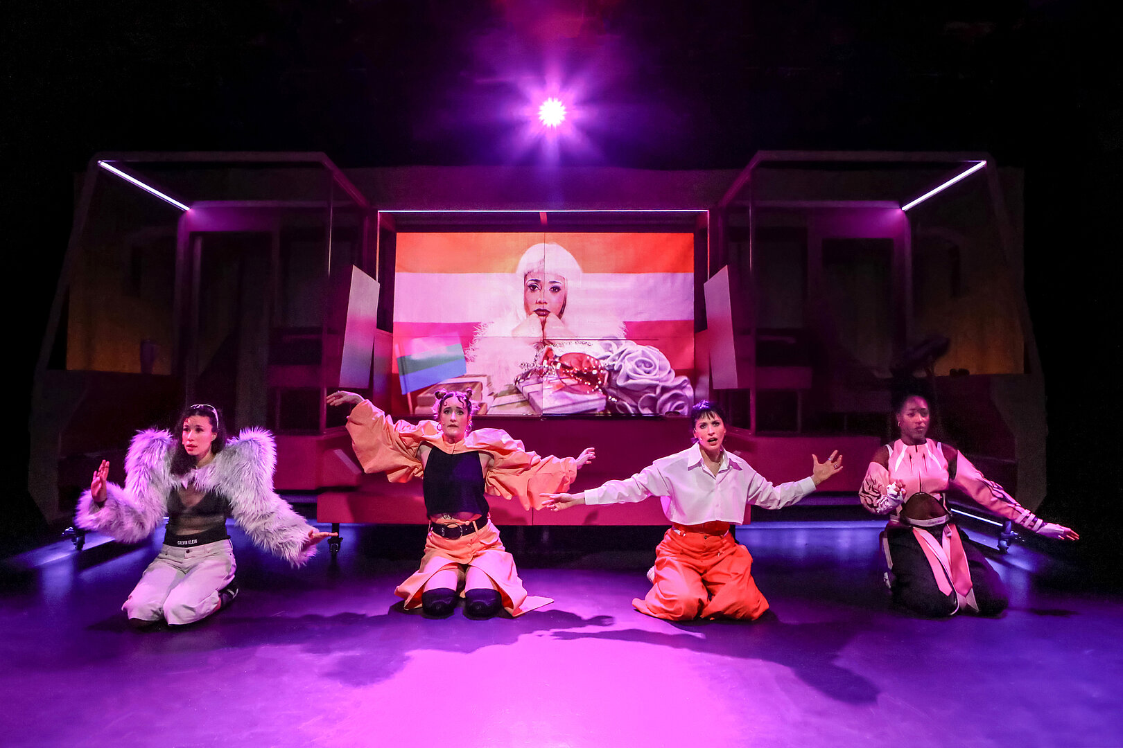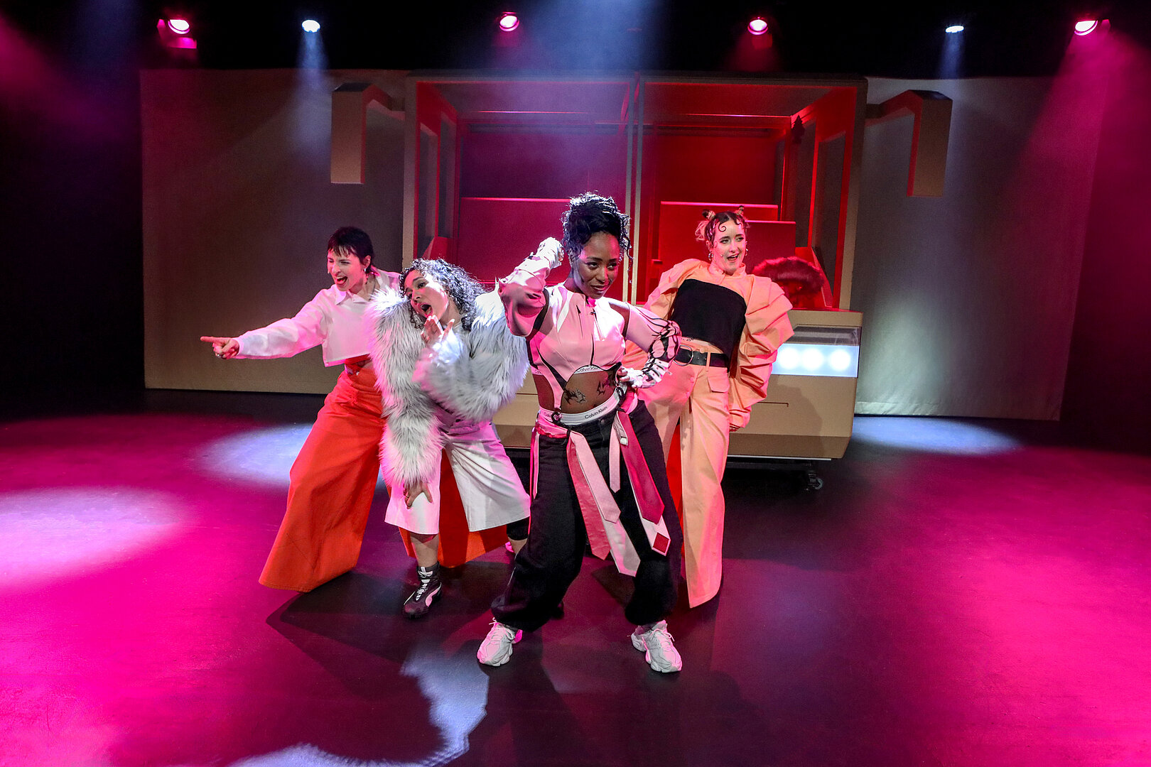 Das Stück lebt von überzeichneten, extrem starken Kostümen, viel Bewegung, Tanz und poppigen Musikelementen. Gleichzeitig werden die vier Protagonistinnen immer wieder aus dem Gruppenkontext herausgelöst. Ihre Gedanken, Zweifel und inneren Konflikte stehen plötzlich allein im Raum – leise, ehrlich und erstaunlich berührend.