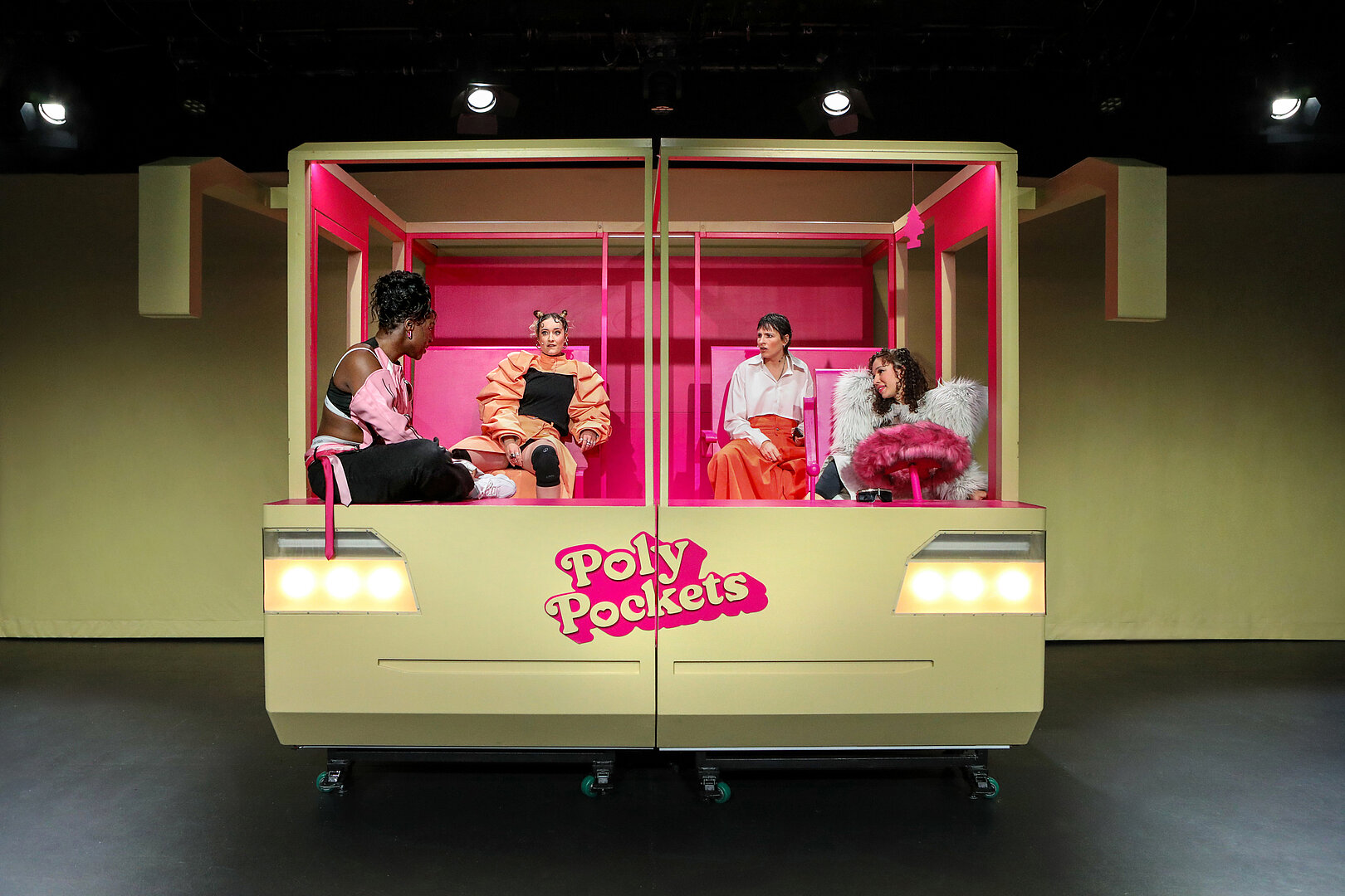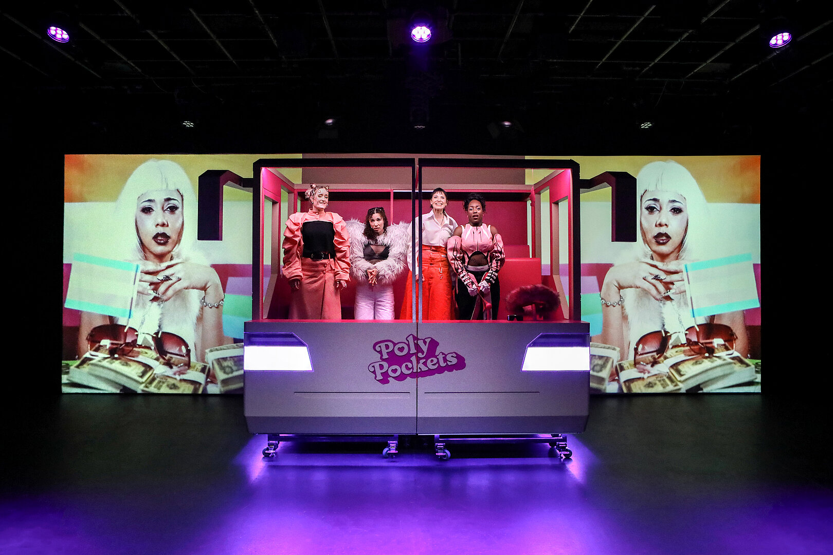Austatterin Lorena Díaz hat die vier Mimen in abgedrehte Kostüme gesteckt und einen tollen Tour-Bus gebaut, innen in rosa Farbe und aufklappbar wie das Polly-Pocket-Spielzeug.“