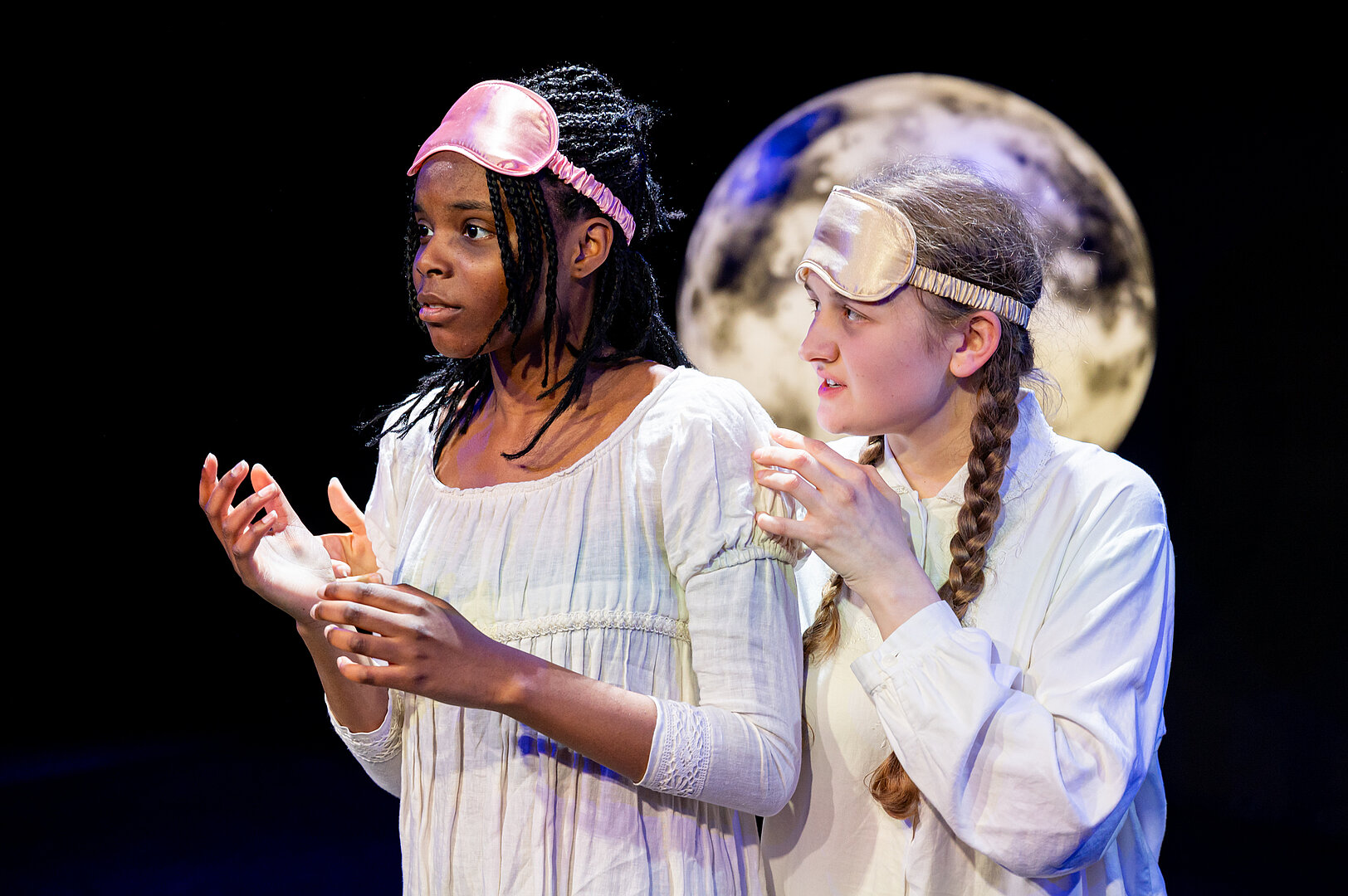 Das Thema „Nacht ohne Schlaf“ zieht sich als roter Faden durch die Stückentwicklung. Aus verschiedenen Perspektiven schaut das Ensemble auf die Farben der Nacht und fragt sich: Was hält uns wach? Und ist das wirklich passiert oder hab‘ ich das nur geträumt? Welche Gedanken lassen mich nicht los, wenn ich auf die Welt und mein eigenes Lebensumfeld schaue?