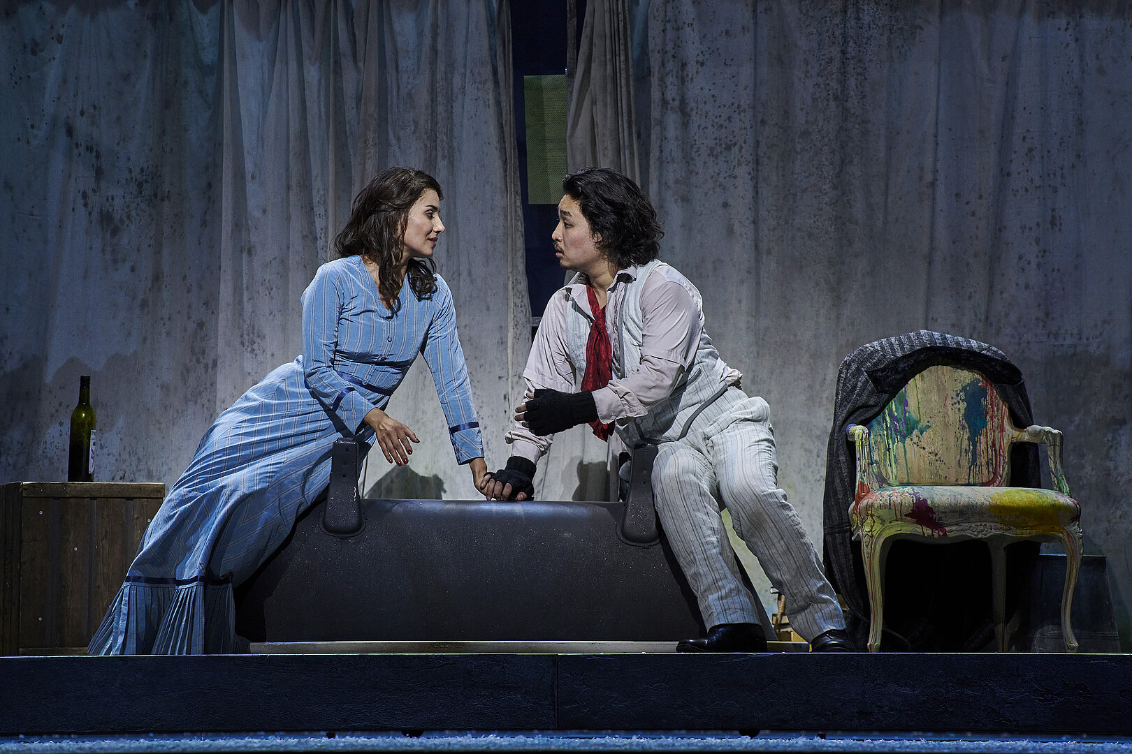 Im Orchestergraben erzeugen Gabriel Feltz und die Dortmunder Phiharmoniker Quirligkeit ebenso wie Tristesse, auf der Bühne wird grandios gesungen – ein Pfund, mit dem diese Aufführung vor allem wuchern kann. Sungho Kim, seit der Spielzeit 2020/21 Ensemblemitglied in Dortmund, ist als Rodolfo geradezu eine Idealbesetzung, schauspielerisch wie sängerisch! Sein Tenor funkelt, erklimmt mühelos jede Höhe, hat Energie bis zum bitteren Ende, verfügt über alle wünschenswerten Farben. Anna Sohn gibt die etwas schüchterne Mimì, lässt gleich zu Beginn in ‚Mi chiamano Mimì‘ vokal die Frühlingssonne aufgehen, entwickelt glaubwürdig ihren Weg bis in den Tod.