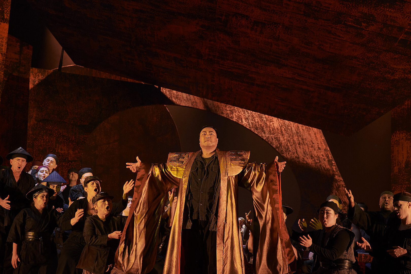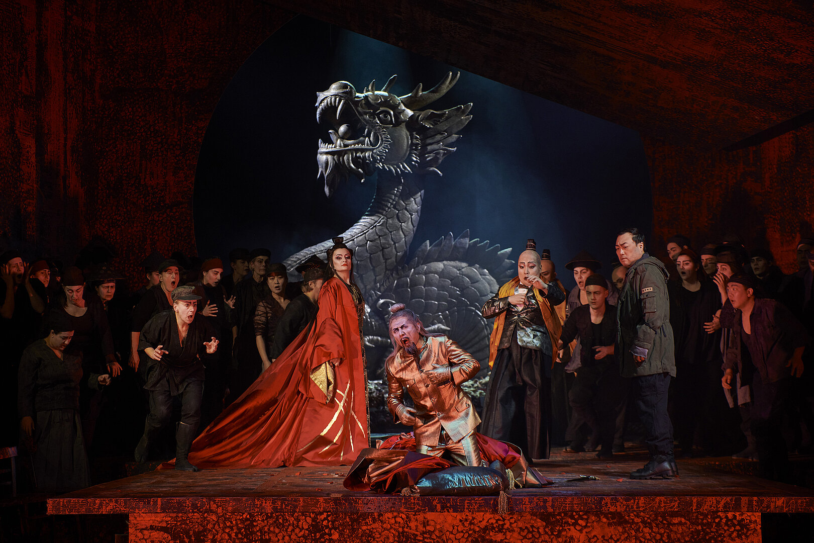 ‚Turandot‘ ist eine Choroper, und Tomo Sugao bindet den spielfreudigen Opern- und Projektchor gut ein. Düster - passend zum Stoff – ist diese auch optisch überwältigende Inszenierung. Es gibt einen Raum mit roten Laternen für die intimeren Momente (Bühne: Frank Philipp Schlößmann; tolle Lichtstimmungen: Florian Franzen) und am Schluss einen gewaltigen Drachenthron, vor dem sich Calaf den goldenen Umgang des toten Kaisers umlegt (prächtige Kostüme: Mechthild Seipel). Es ist ein Erlebnis, diese Inszenierung noch einmal sehen zu dürfen.“