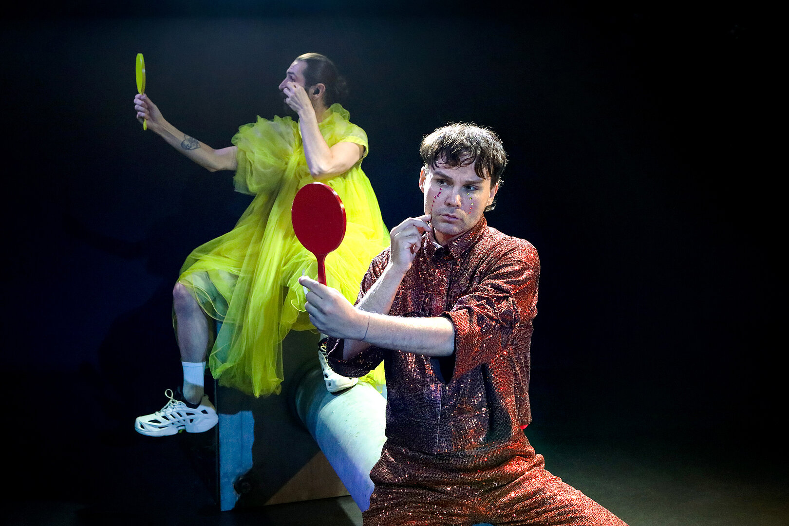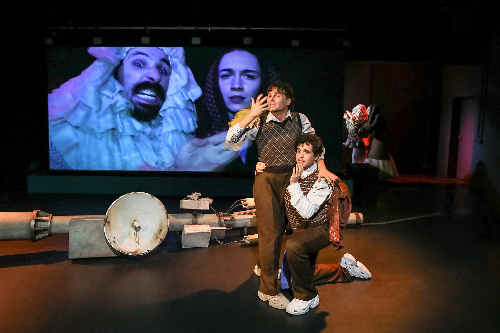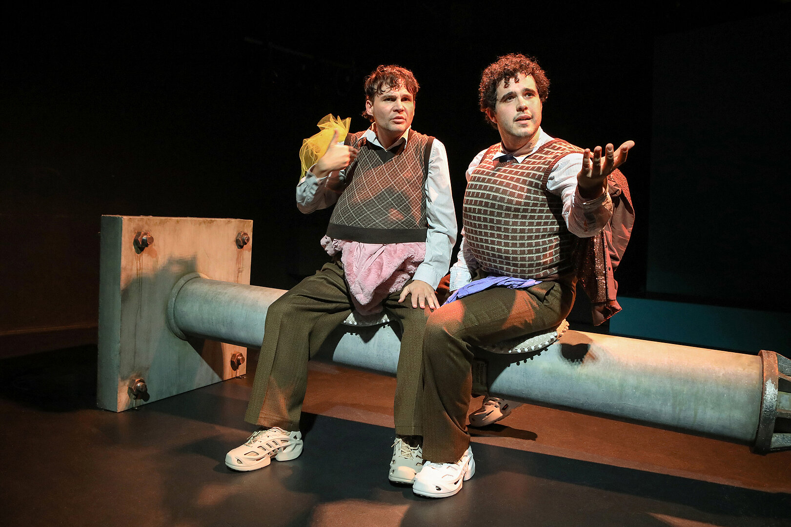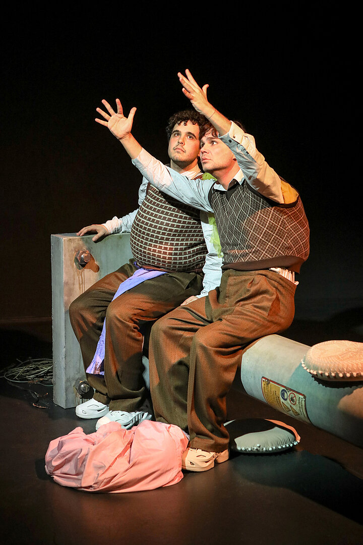 Der Abend schafft immer wieder starke Bilder, zum Beispiel wenn sich Rafael-Evitan Grombelka und Roberto Romeo gegenüber sitzen in altmodisch gemusterten Pullundern, unter die sie sich andere Kleidungsstücke stopfen, sodass sie zu ausgepolsterten Biederfiguren werden, zuweilen wie ein siamesischer Zwilling. Romeo spricht von Familienverhältnissen, Grombelka gebärdet.