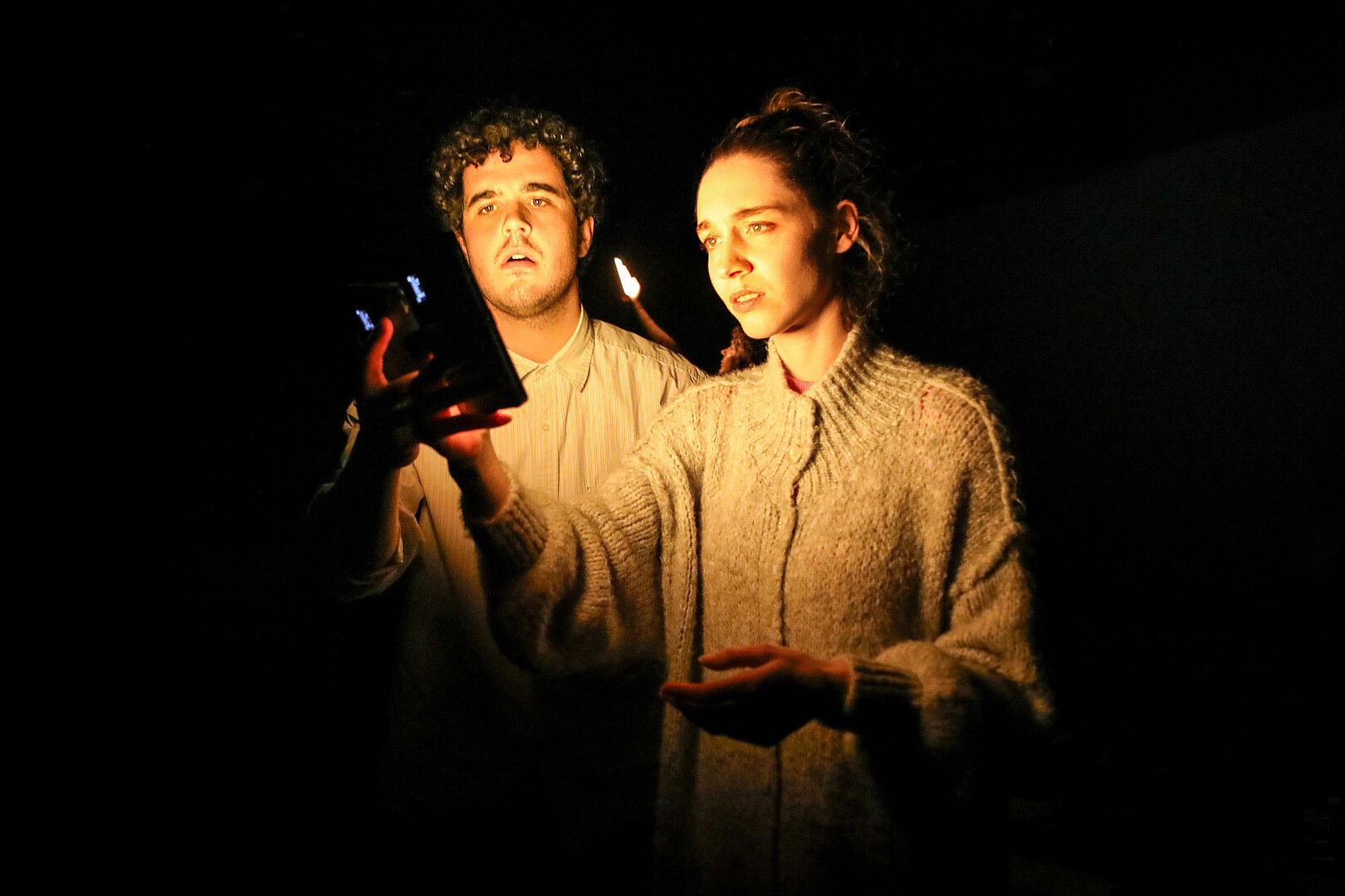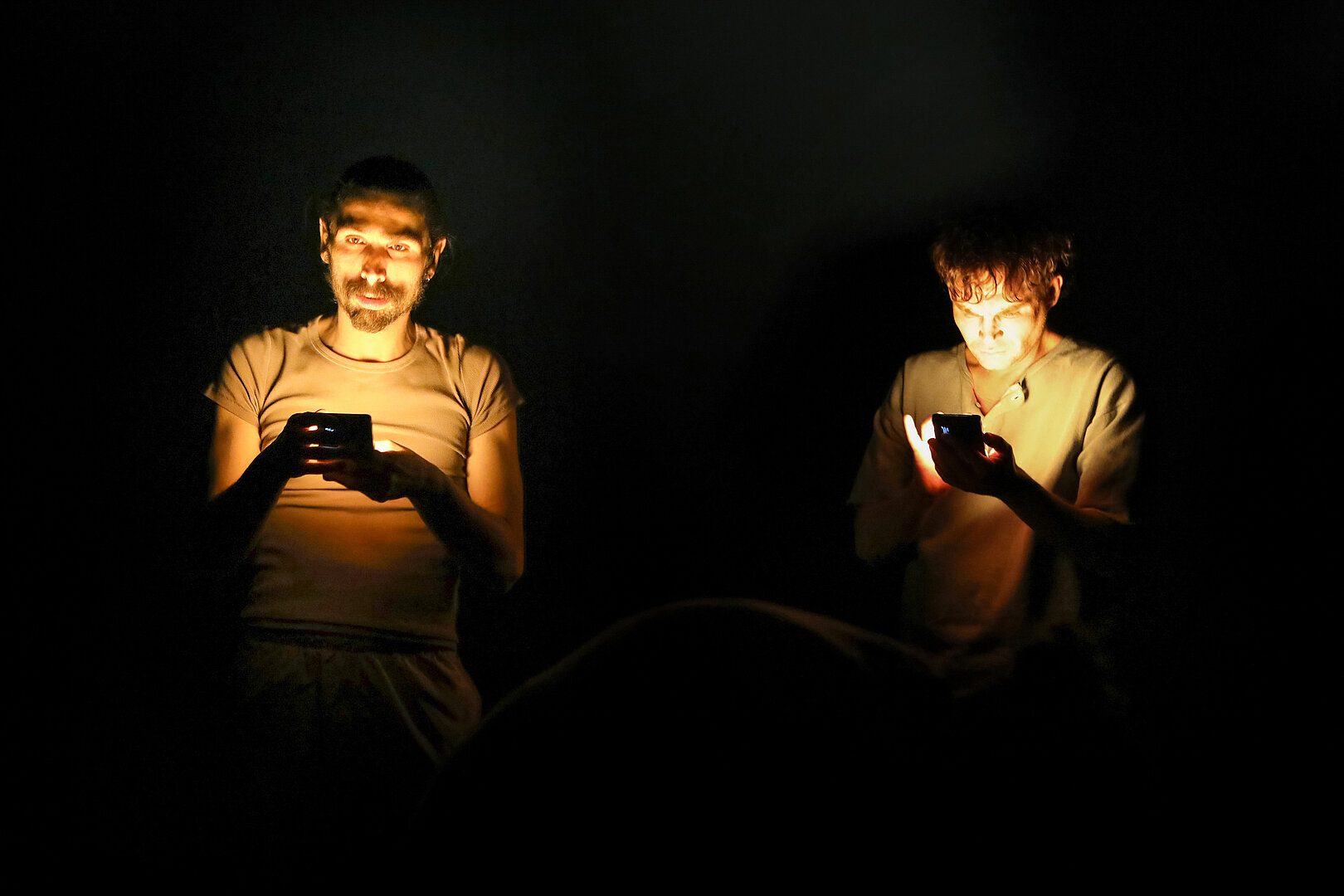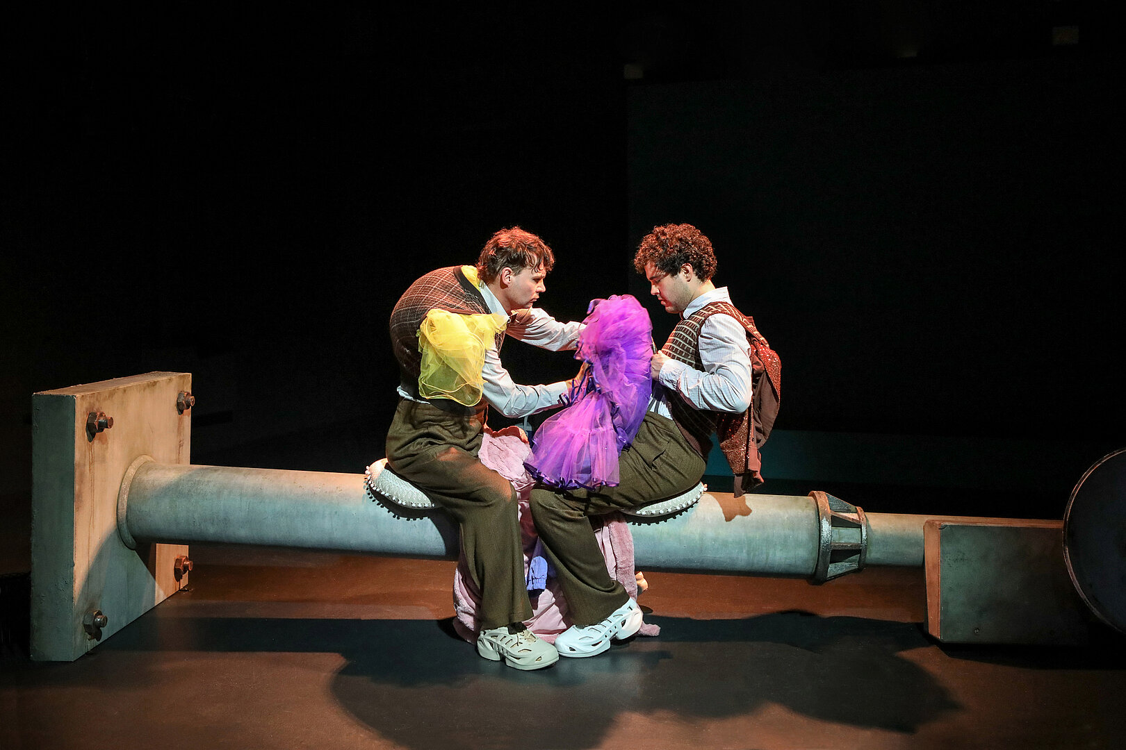 Der Abend schafft immer wieder starke Bilder, zum Beispiel wenn sich Rafael-Evitan Grombelka und Roberto Romeo gegenüber sitzen in altmodisch gemusterten Pullundern, unter die sie sich andere Kleidungsstücke stopfen, sodass sie zu ausgepolsterten Biederfiguren werden, zuweilen wie ein siamesischer Zwilling. Romeo spricht von Familienverhältnissen, Grombelka gebärdet.